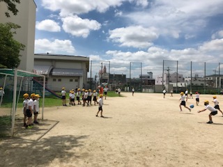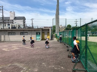 鉄棒、ボール遊び、一輪車などで、子どもたちが遊んでいます。