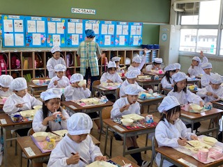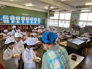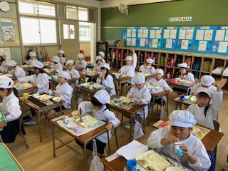 当番の子どもたちは準備から片付けまで手際よくできるようになりました。周りの子どもたちも協力してくれます。「いただきます」のあいさつの後マスクを外します。