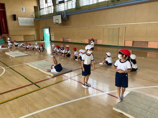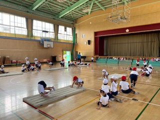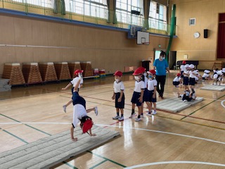 1年生の体育の学習の続きです。先生たちが見守る中、けがをしないように、集中して取り組んでいます。