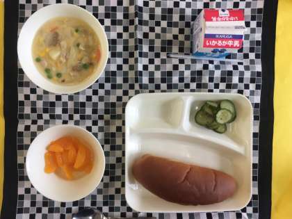 コーンクリームシチュー、きゅうりのバジル風味サラダ、みかん(缶)、パン、牛乳