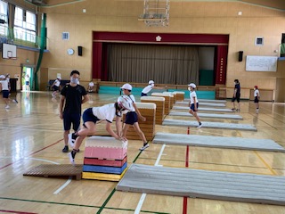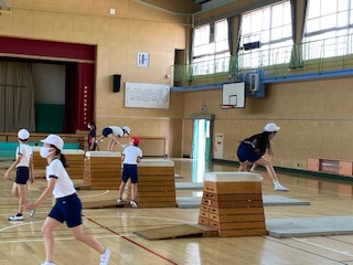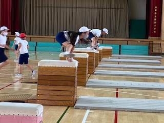 子どもたちが跳び箱に挑戦しています。しっかりと手をつき着地も決めていました。
