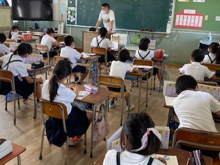 1組は、国語科で、漢字の勉強をしました。「漢」や「開」などの書き順、読み方について学習しました。子どもたちが、先生と一緒に指を使って書き順を確認しています。