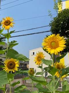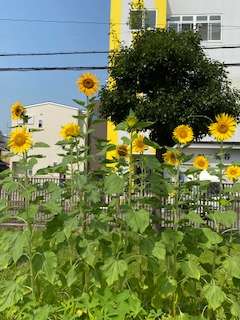 学習園の「ひまわり」が満開です。青空のもと、大輪の花が風にそよいでいました。