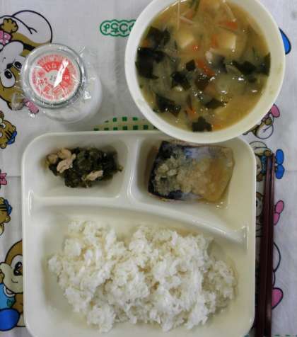 さばのみぞれかけ、みそ汁、おおさかしろなの煮びたし、ご飯、牛乳