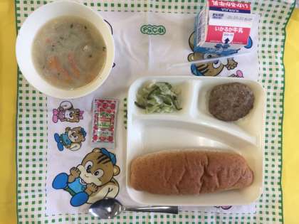 焼きハンバーグ、豆乳スープ、キャベツとピーマンのソテー、ライ麦パン、牛乳