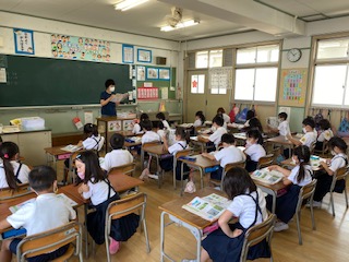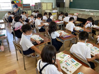 1組の生活科では、「むしをさがそう」を学習しました。教科書のいきものずかんを見てショウリョウバッタなどを探しました。虫となかよくなってください。