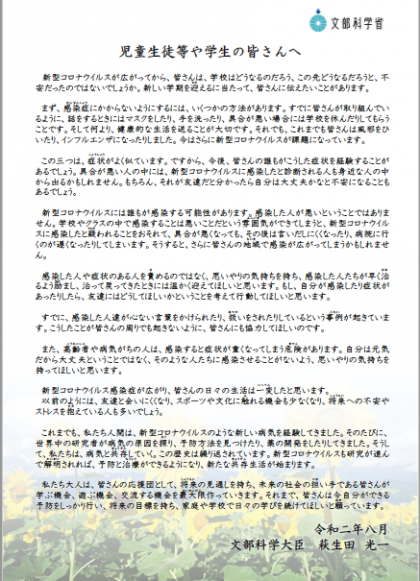 文部科学省より文部科学大臣からのメッセージが発表されました。