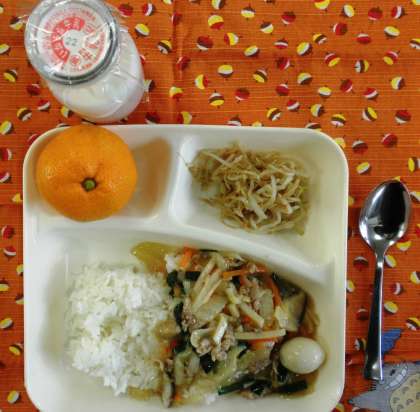 中華丼、もやしの中華あえ、みかん、牛乳