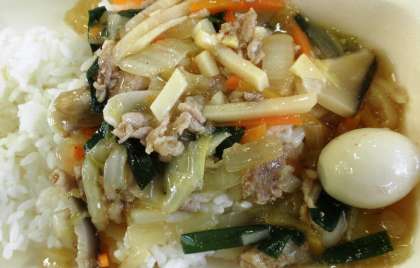 豚肉、うずら卵を主材にはくさい、たまねぎなどの野菜たっぷりの丼です。