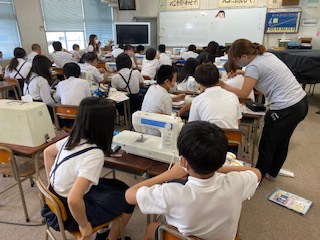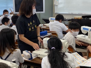 1組の子どもたちが「ミシンぬいにチャレンジ」、ミシンの使い方を学習しました。