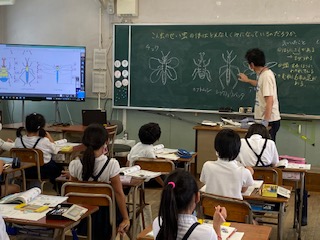 2組の理科では、「昆虫の体のしくみ」について学習しました。チョウやカブトムシ・バッタやトンボの体を見て、気づいたことやもっと調べたいことを発表しました。