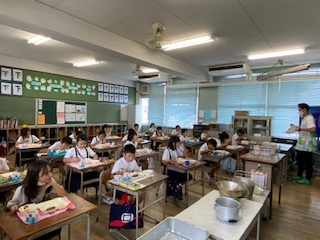 3年生の給食時間のようすです。1組では実習の先生も一緒に食べました。