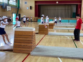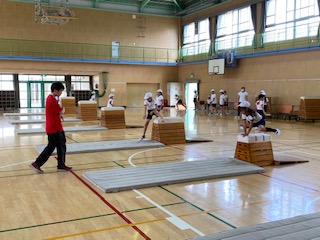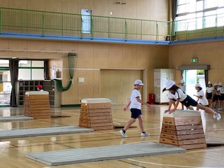 1組の体育は、とび箱運動です。子どもたちがそれぞれ自分に合った高さに挑戦しています。担任の先生や実習の先生から声をかけてもらい頑張っていました。