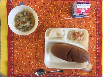 鶏肉とてぼ豆のスープ煮、じゃがいもとトマトのチーズ焼き、なし(豊水)、おさつパン、牛乳