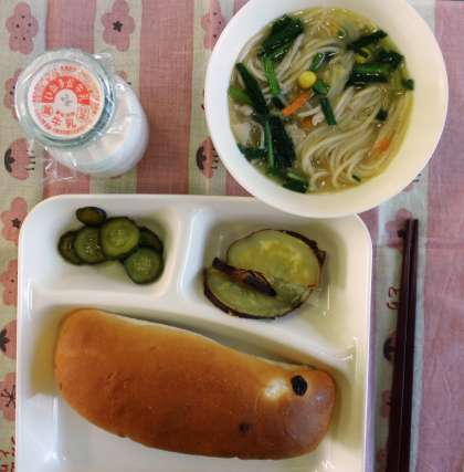 みそラーメン、焼きさつまいもの甘みつかけ、きゅうりの辛みづけ、レーズンパン、牛乳