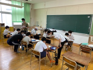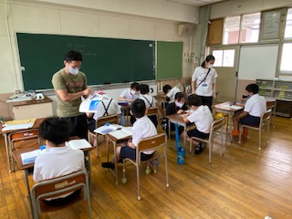 子どもたちが、国語の本読みや漢字・ひらがなの練習、算数のプリントなどに取り組んでいます。教育実習の先生たちにも教えてもらいました。