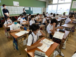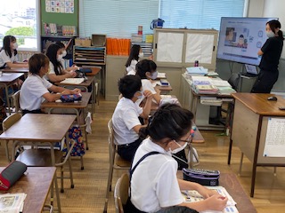 テレビ画面から流れる音声を聞きとり、ワークに時間を記入しました。