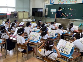 1組の音楽科「どれみ のばしょをおぼえましょう」です。先生のお話を聞いて、鍵盤上でドレミの場所を見つけ抑えます。