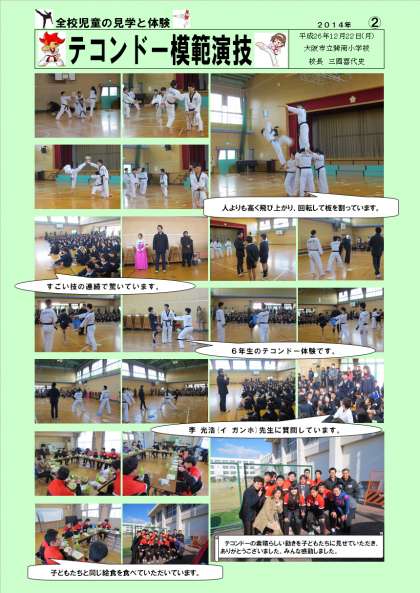 来校していただいた指導者の方々は、現在、世界テコンドー連盟の国際審判員であり、国際師範7段の李 光浩(イ ガンホ)先生をはじめ12名のテコンドー有段者の方々です。今日見せていただいた演技は、(1)基本的な動作(2)基本的な撃破(3)とび横蹴り・とび後ろ回し蹴り(4)とびターン蹴り・回し蹴り3番(5)合わせて競争・護身術(6)垂直4段階・一列撃破(7)コリョ型(8)連続蹴り4段階(9)頭上のリンゴをターン蹴り・720度ターン蹴り・540度後ろ回し蹴り2段階(10)多方向撃破(11)しょうがい物乗り越え蹴り等を連続で見せていただきました。どの演技も終わるごとに大きな拍手がおくられ、子どもたちは素早い動き、力強さに感動していました。