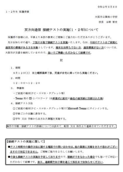 9/9に保護者用マニュアルを配付しています。マニュアルを参照の上、接続テストをお願いします。