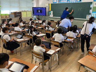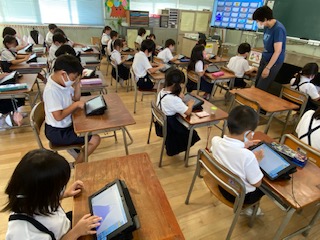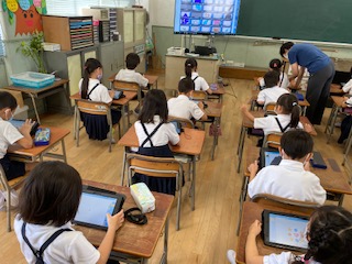 この日行うオンライン接続テストに向けて「Teams」へのサインインを再確認しました。その後、子どもたちは画面で絵を描いたりする操作を通して、タブレット端末に親しみました。描いたものが前の大型テレビで写されると「わあっ」と声が上がっていました。