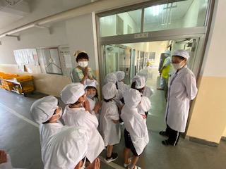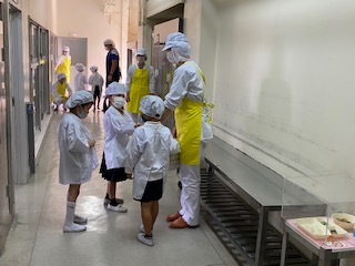 給食調理員さんが迎えてくれます。毎日ありがとうございます。 (写真は2年生・1年生です)