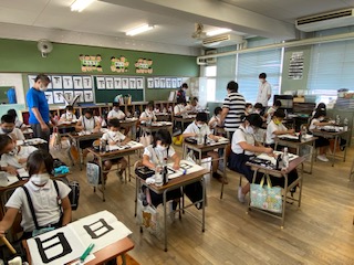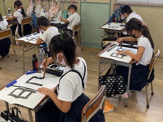 先生からは、姿勢が大事と注意があり、背筋を伸ばして書いていました。