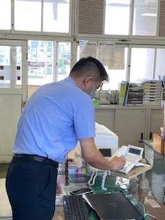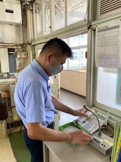 職員室で、先生たちがよく使うドアノブや電話、放送機器などを教頭先生がアルコールを使って消毒しています。