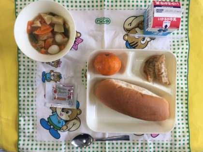 あげぎょうざ、中華煮(うずら卵)、みかん(れいとう)、コッペパン、りんごジャム、牛乳