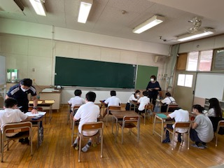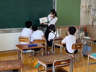 初めに先生が絵本の読み聞かせをしてくれました。子どもたちが身を乗り出して聞いています。その後は、ローマ字の練習や漢字・計算など自分たちの勉強をしました。