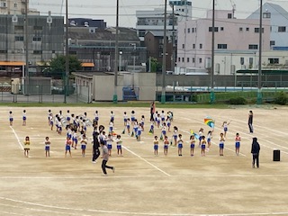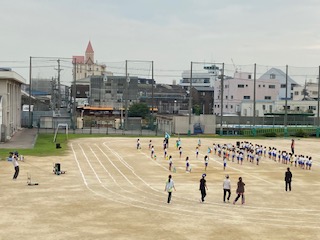 10月3日に、日の出学園の運動会が本校で行われます。今日はその練習に園児たちがやってきました。頑張っている姿を、卒園した1年生が懐かしそうに見ていました。