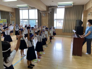 今日はたくさんのお友達と一緒に楽しく活動しました。先生のひくオルガンの音に合わせて「じゃんけんぽんの歌」などを歌いました。