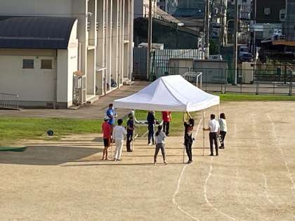 児童が帰った後、教職員で本部テントの設営と入退場門の設置作業を行いました。10月11日の運動会に向けて、準備が進み、練習にも熱が入っていきます。