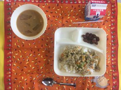 他人丼、とうがんのみそ汁、金時豆の煮もの、牛乳