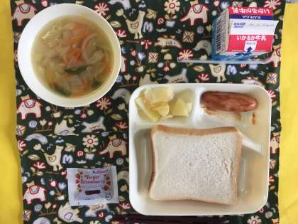 フランクフルトのケチャップソース、スープ、焼きじゃが、パン、いちごジャム、牛乳