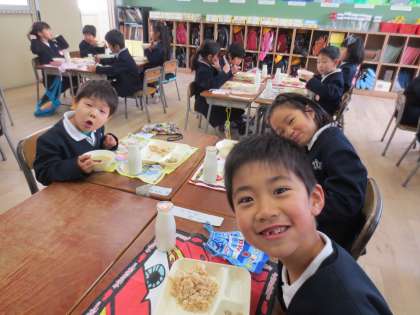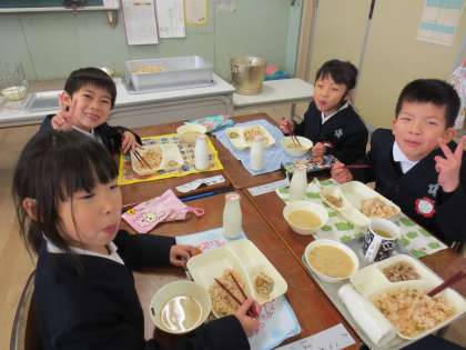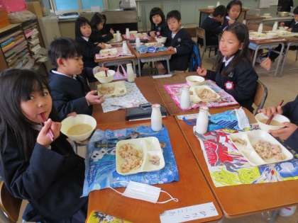 今日の給食は、白玉入り「お雑煮」「さけちらし」「焼きれんこん」の正月献立でした。子どもたちは、とても美味しいと、楽しそうに食べていました。