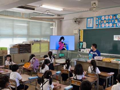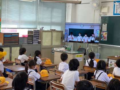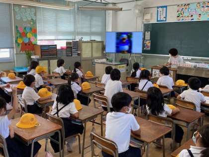 テレビ画面で、少しずつモザイクがとれてキャラクターが浮かび上がってきました。子どもたちは大喜びです。(1年生の教室のようすです。)