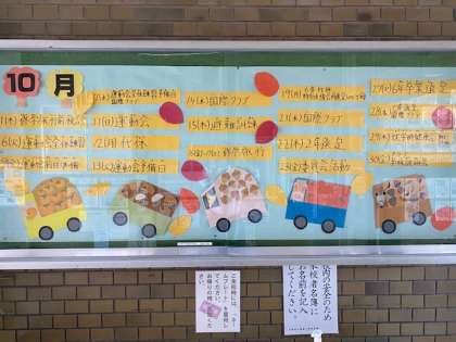 今年は、昨日(10/1)が「中秋の名月」でした。陰暦で言う秋のちょうど真ん中の日を中秋と呼び、この日にお月見をするならわしです。この時期には満月かほぼ満月に近い月が見られます。お月見と言えば「ススキ」に「月見団子」、残念ながら校庭にススキはありませんでした。「団子」は給食で出ていました。