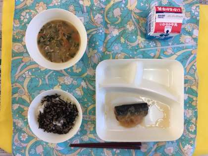 さんまのみぞれかけ、みそ汁、牛ひじきそぼろ、ご飯、牛乳