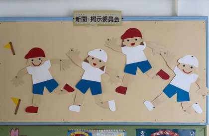 新聞掲示委員会の掲示板です。紅組の子どもたちも白組の子どもたちも楽しそうです。