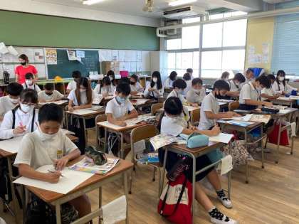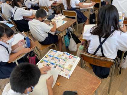 1組の社会科です。資料集を見て、歴史上の人物の似顔絵を描いています。それぞれの人物が生きた時代や業績などもしっかりと見直しておいてください。
