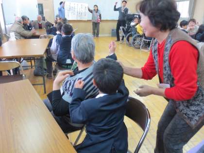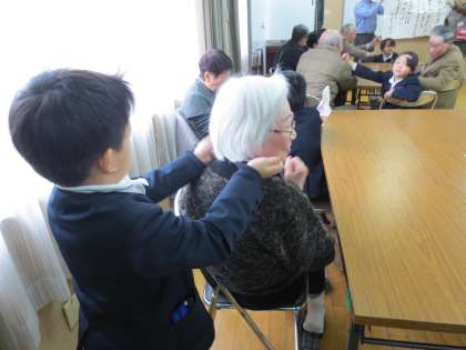 「かたたたき」の歌に合わせて肩をたたいています。どのお年寄りの方々も笑顔いっぱいでした。