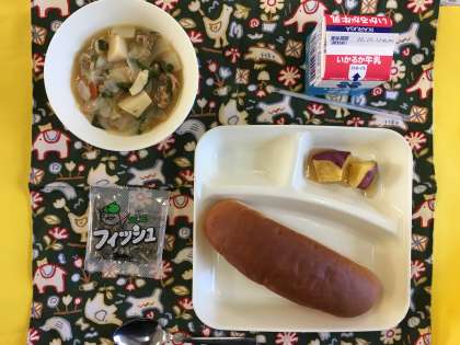 豚肉といかの中華煮、大学いも、ミニフィッシュ、パン、牛乳
