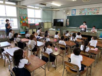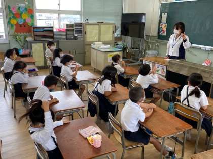 国際クラブのソンセンニムが、水曜日に学級で子どもたちと給食交流をします。今日は1年1組です。食事が終わり、お話を聞いた後、一緒に「ごちそうさま」をしました。