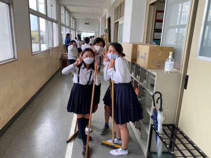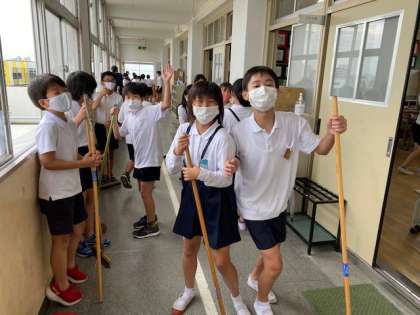 北館4階の5年生の教室前です。子どもたちが、すすんで掃除をしています。助けあって「いい学級にしよう」という思いが出ています。