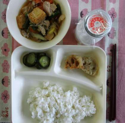 鶏肉とあつあげの煮もの、れんこんのてんぷら、きゅうりのおかかあえ、ご飯、牛乳
