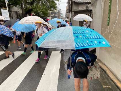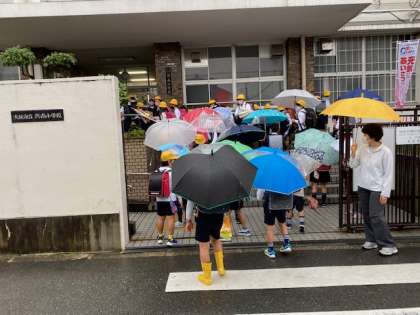色とりどりの傘の花です。雨の中、今日も子どもたちが、元気に登校してきました。