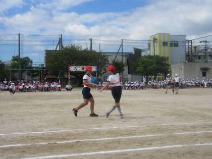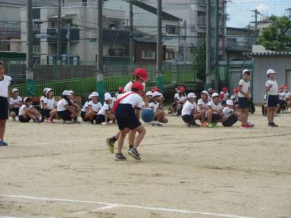 5年生の「GO!GO!!5年生」の様子です。ボールをバドミントンのラケットで、二人で協力して運びます。みんな上手に運んでいました。
