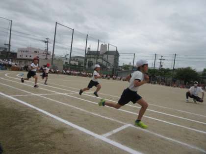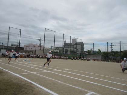 3年生の徒競走、「ロケットダッシュ」の様子です。運動会の学年競技の一番目!ロケットダッシュで駆け抜けました。