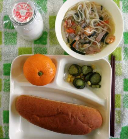 チャンポン、きゅうりとコーンの中華あえ、みかん、ライ麦パン、牛乳